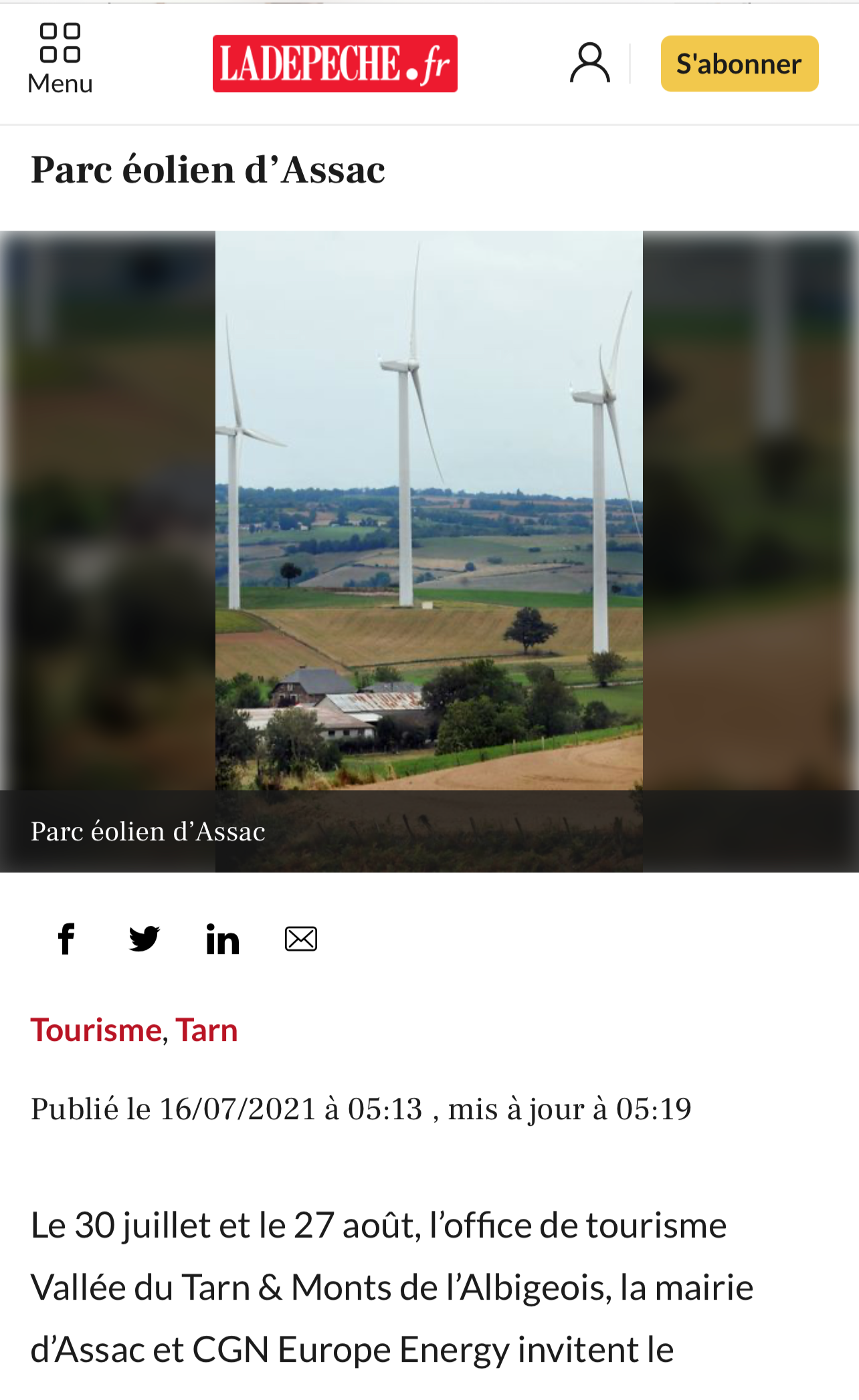 法國(guó)旅游網(wǎng)站Losiramag刊登報(bào)道中廣核歐能公司聯(lián)合塔恩河谷和阿爾比蓋奧山旅游局和Assac市政府將在今年夏天開展的“探索風(fēng)電場(chǎng)”為主題的公益性參觀活動(dòng)的旅游信息。