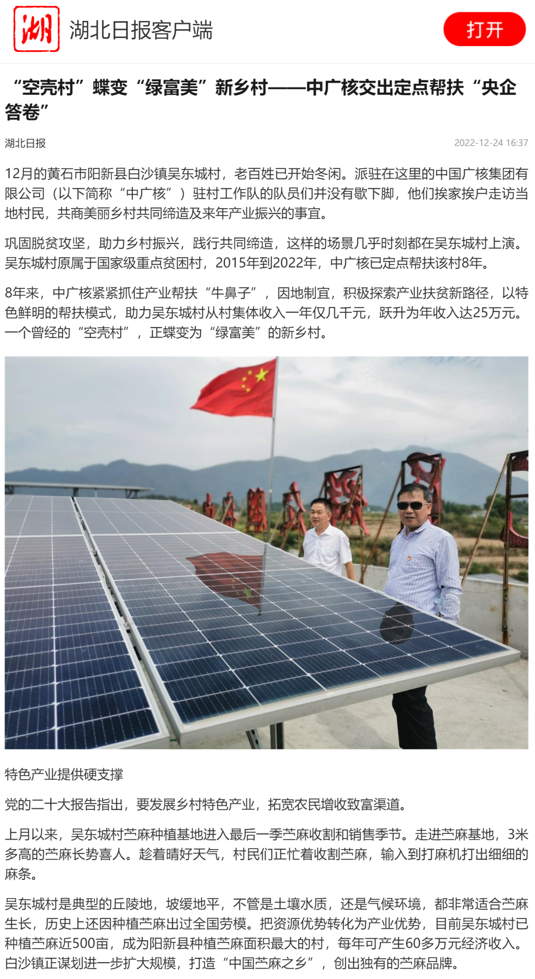 近日,湖北日?qǐng)?bào)聚焦報(bào)道,中國(guó)廣核集團(tuán)從2015年到2022年定點(diǎn)幫扶湖北省黃石市陽(yáng)新縣白沙鎮(zhèn)吳東城村,積極探索產(chǎn)業(yè)扶貧新路徑,以特色鮮明的幫扶模式助力吳東城村脫貧攻堅(jiān),從“空殼村”變成“綠富美”新鄉(xiāng)村。