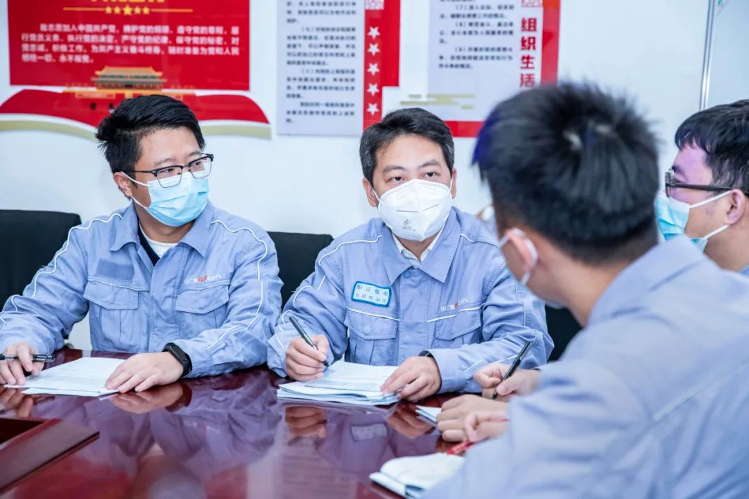 ▲趙鋒(左二)組織團(tuán)隊(duì)探討技術(shù)方案改進(jìn)