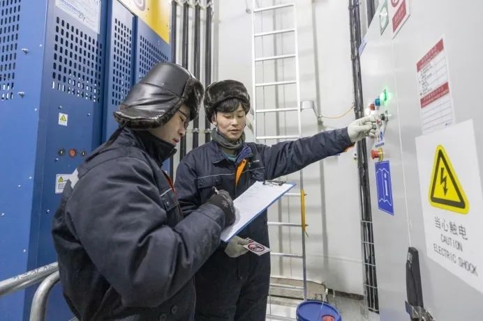 ▲中廣核潤(rùn)澤風(fēng)電場(chǎng)運(yùn)維班在風(fēng)機(jī)內(nèi)檢修設(shè)備
