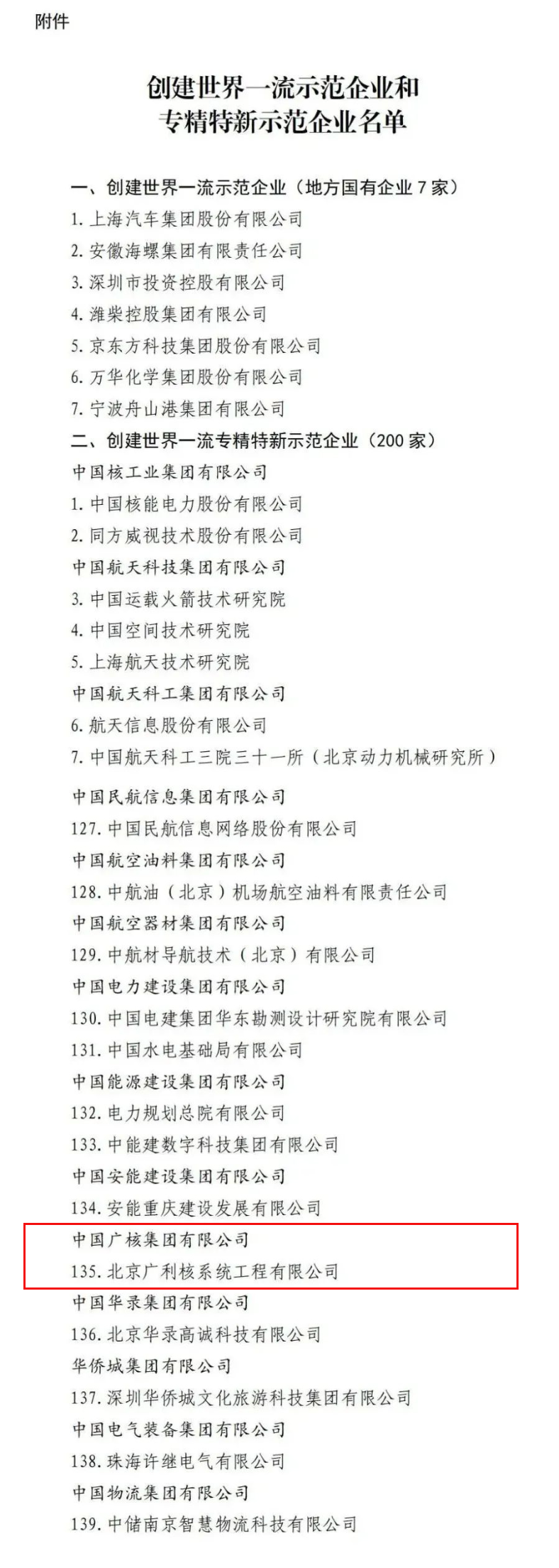 近日,國務(wù)院國資委印發(fā)《創(chuàng)建世界一流示范企業(yè)和專精特新示范企業(yè)名單》,中國廣核集團(tuán)下屬北京廣利核系統(tǒng)工程有限公司入選該名單,成為全國200家創(chuàng)建世界一流專精特新示范企業(yè)之一。