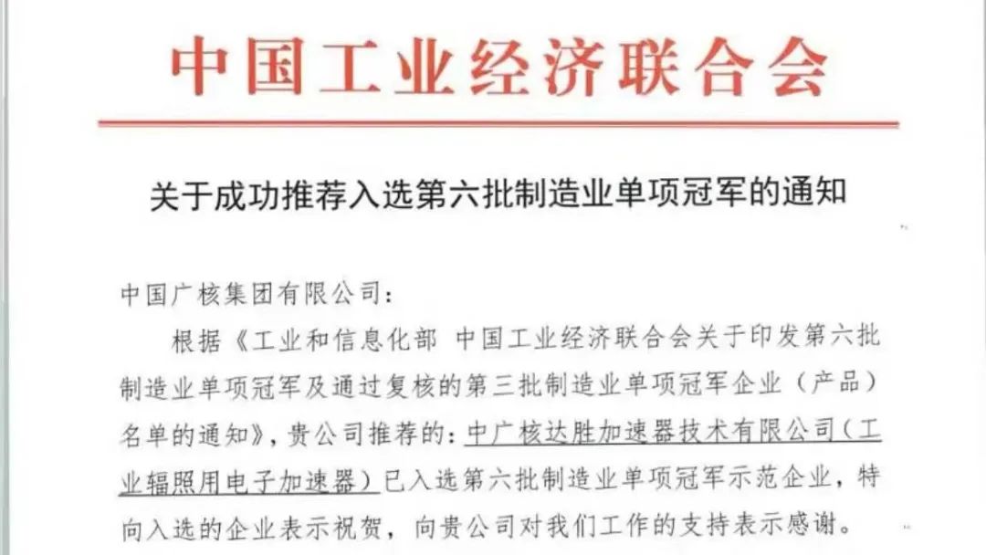 2019年和2021年,北京廣利核系統(tǒng)工程有限公司、中廣核達(dá)勝加速器技術(shù)有限公司分別憑借主營產(chǎn)品——核電站數(shù)字化控制保護(hù)系統(tǒng)和電子加速器,成功入選工信部認(rèn)定的制造業(yè)單項(xiàng)冠軍示范企業(yè),該稱號被譽(yù)為“制造業(yè)皇冠上的明珠”。該項(xiàng)評選旨在引導(dǎo)企業(yè)專注細(xì)分產(chǎn)品領(lǐng)域的創(chuàng)新、產(chǎn)品質(zhì)量提升和品牌建設(shè),突破關(guān)鍵領(lǐng)域短板,培育具有全球競爭力的世界一流企業(yè)。
