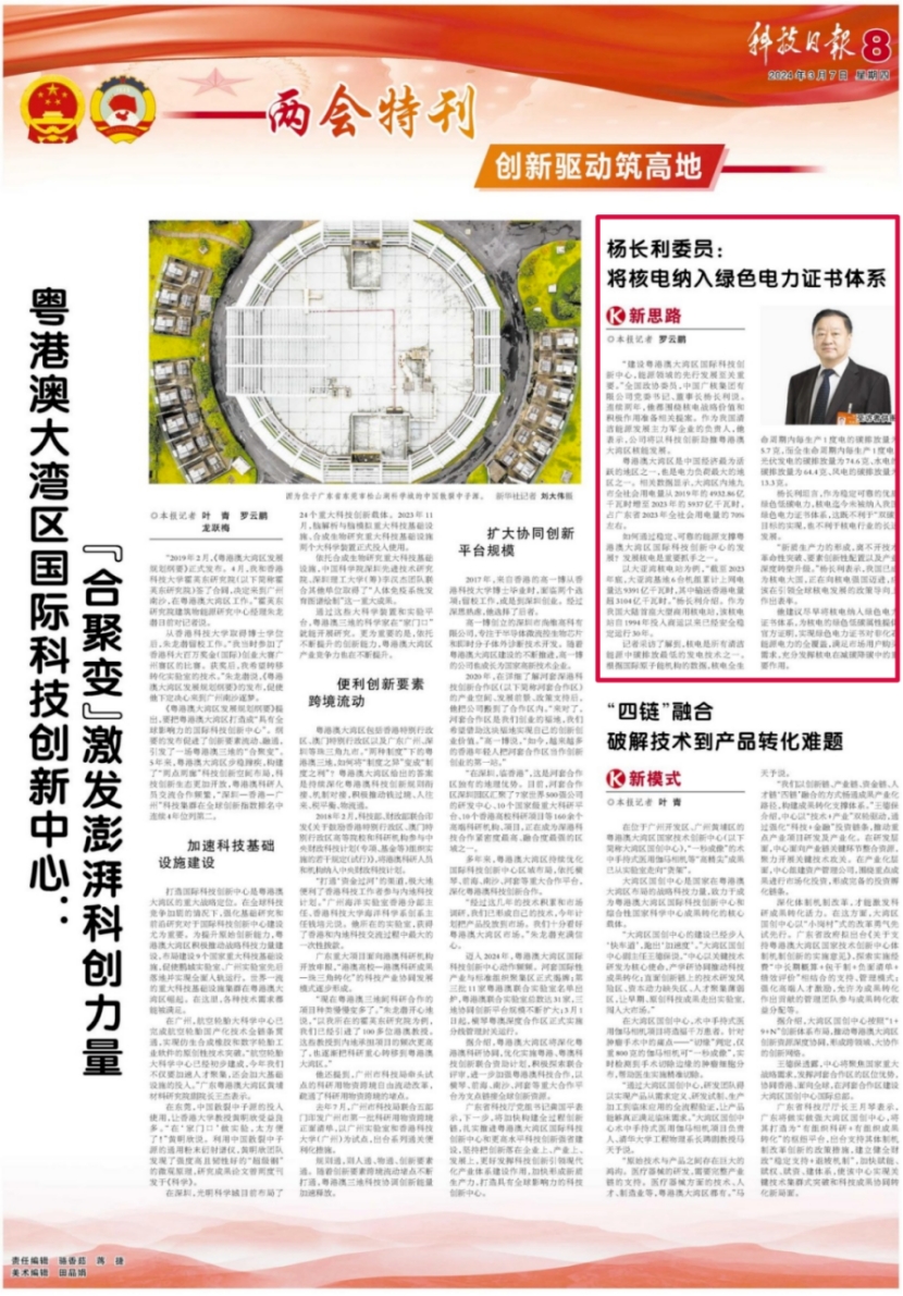 “建設(shè)粵港澳大灣區(qū)國際科技創(chuàng)新中心,能源領(lǐng)域的先行發(fā)展至關(guān)重要。”全國政協(xié)委員,中國廣核集團(tuán)有限公司黨委書記、董事長楊長利說。連續(xù)兩年,他都圍繞核電戰(zhàn)略價值和積極作用準(zhǔn)備相關(guān)提案。作為我國清潔能源發(fā)展主力軍企業(yè)的負(fù)責(zé)人,他表示,公司將以科技創(chuàng)新助推粵港澳大灣區(qū)核能發(fā)展。
