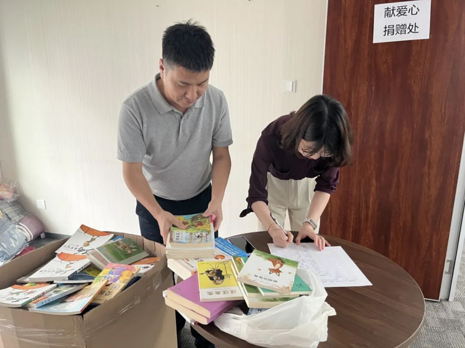 ▲中廣核能源國際志愿者正在整理為孩子們愛心捐贈的物品
