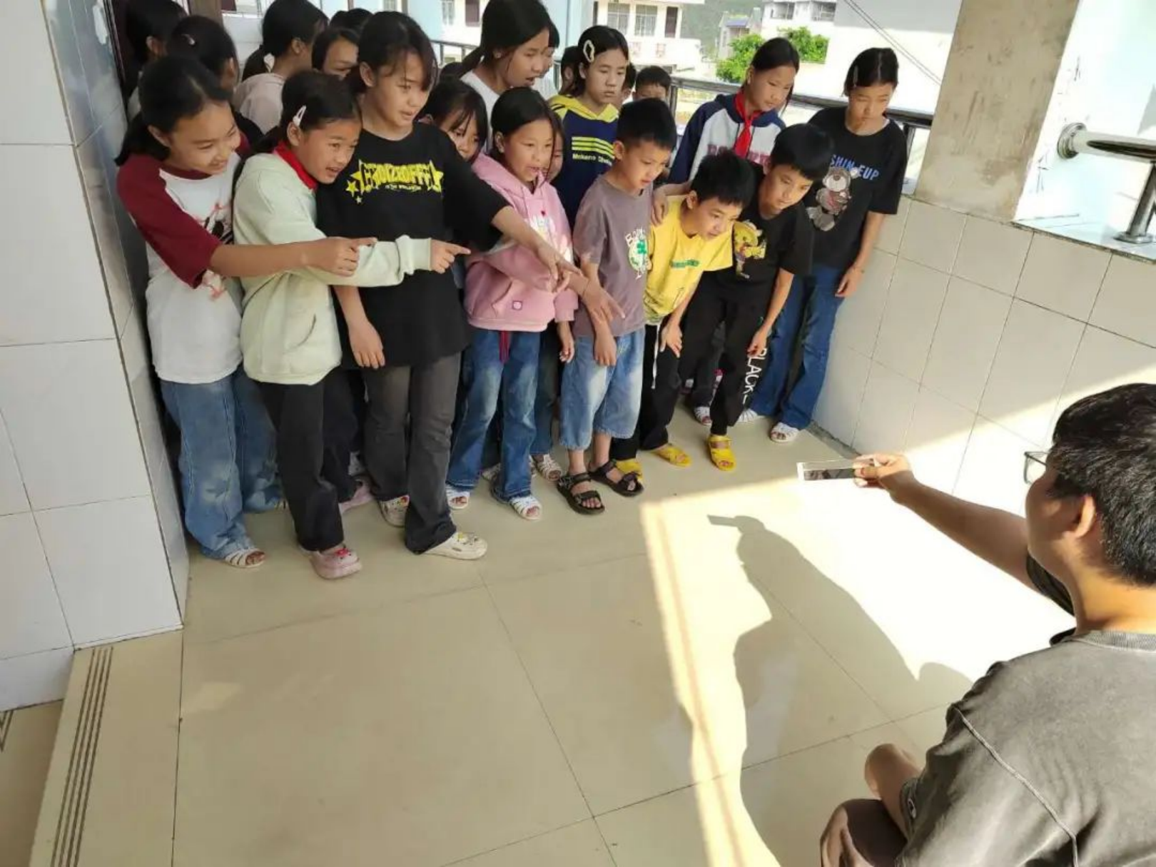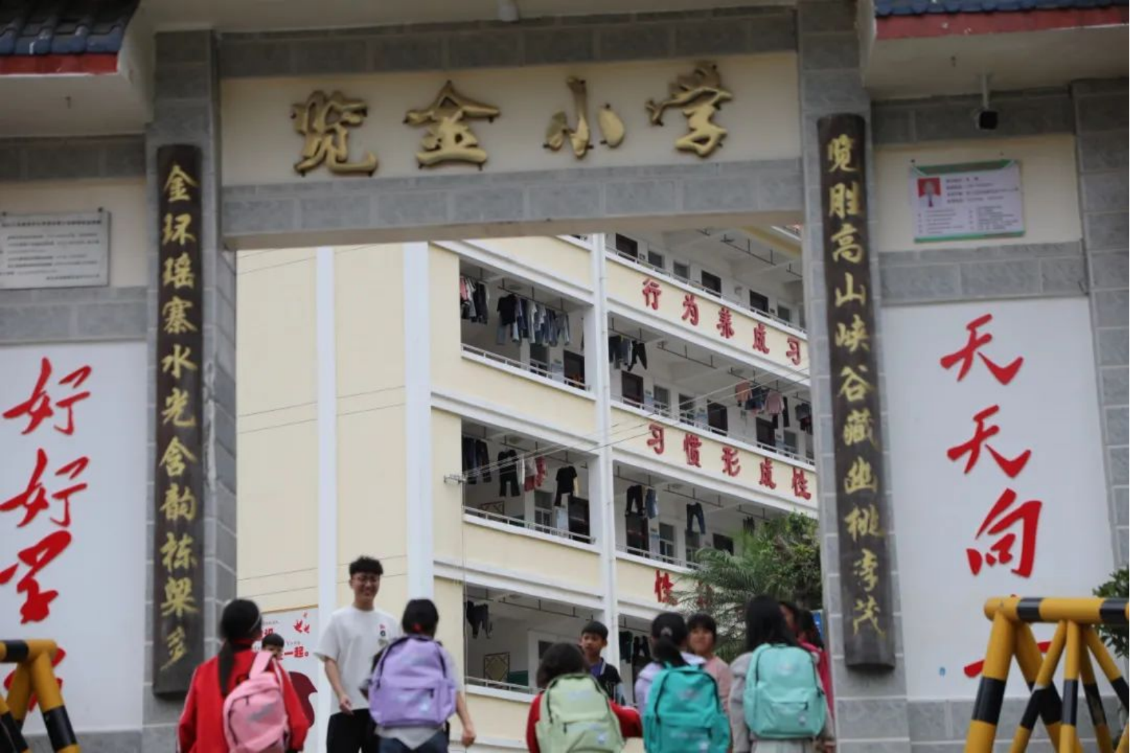 ▲校門口,孩子們背著彩虹項(xiàng)目組捐贈的新書包,與守候多時(shí)的支教老師再次重逢