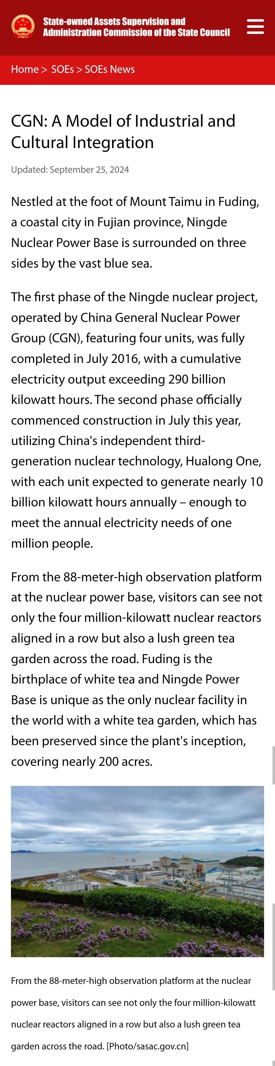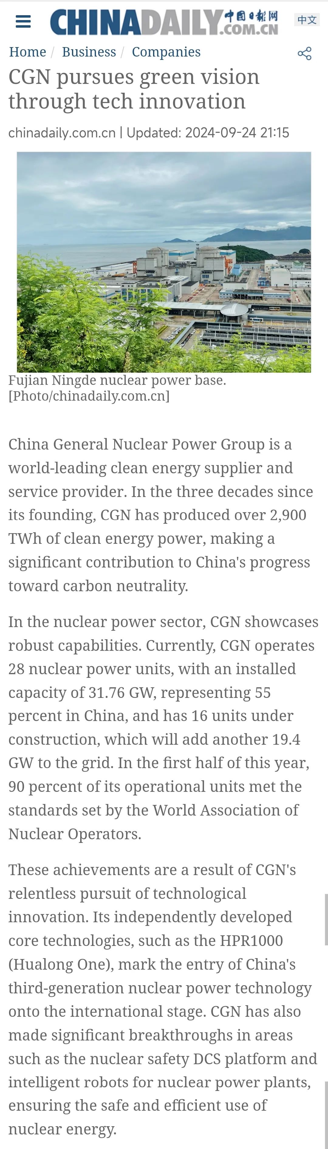 將寧德核電稱贊為“綠色能源與地方共榮的范例”