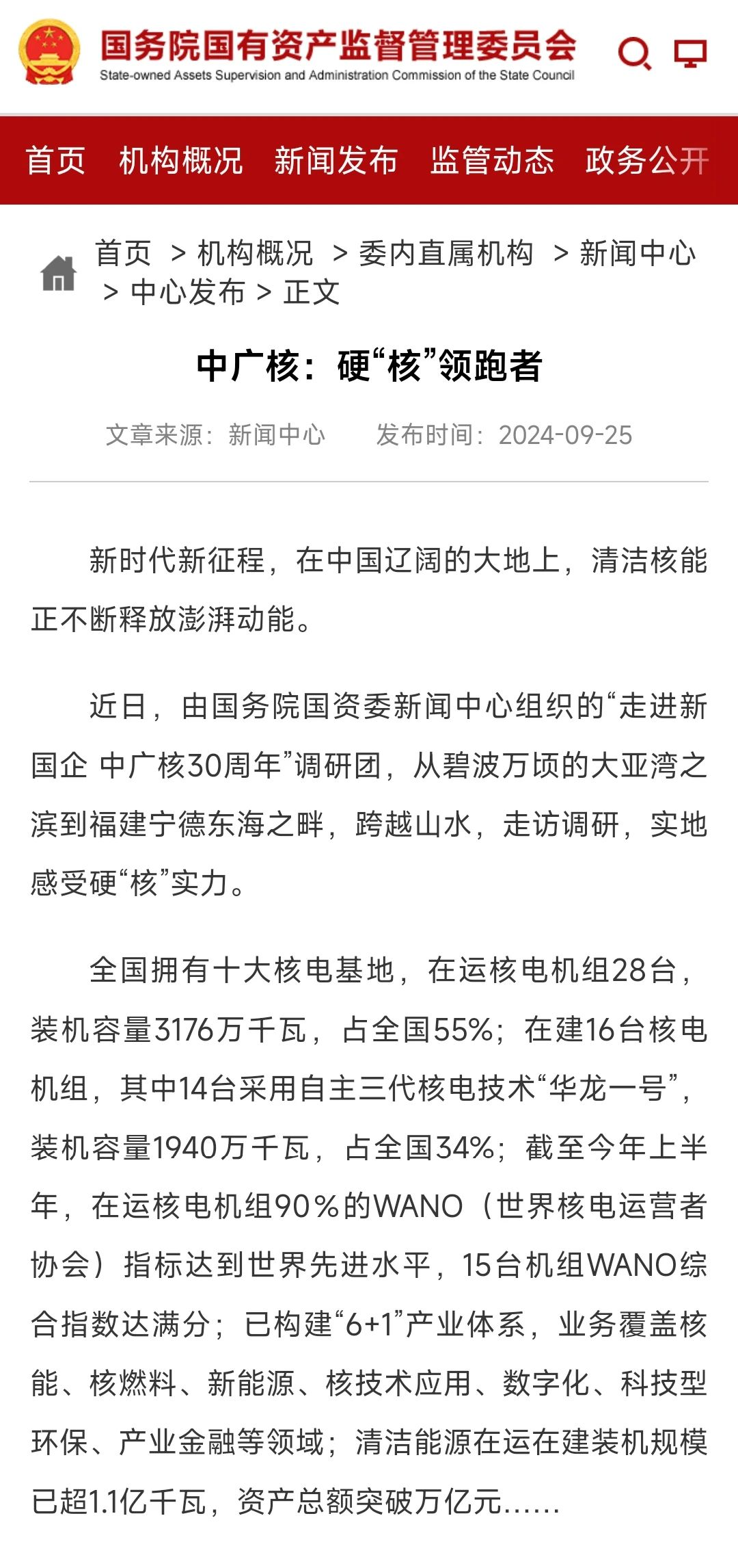國(guó)務(wù)院國(guó)資委官網(wǎng)以《硬“核”領(lǐng)跑者》為題