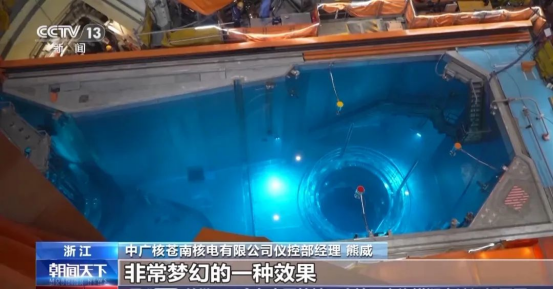 “這個(gè)區(qū)域就是整個(gè)核島廠(chǎng)房最核心的區(qū)域,我們一般叫反應(yīng)堆水池。這里面的液體是含硼酸的溶液,所以呈現(xiàn)的效果是非常漂亮,非常夢(mèng)幻的?,F(xiàn)在因?yàn)槭钦w的系統(tǒng)調(diào)試階段,這個(gè)階段把水先充上,檢查整個(gè)水池的泄漏情況,主要是對(duì)前期的密封效果進(jìn)行檢驗(yàn)?!毙芡榻B到。
