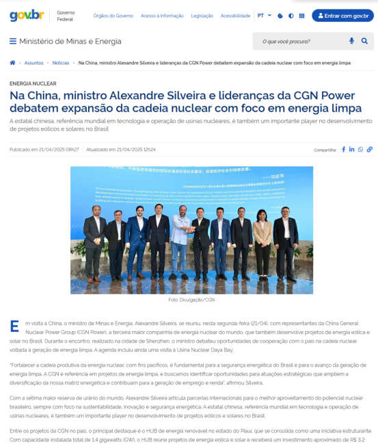 4月21日,中國廣核集團(tuán)有限公司總經(jīng)理高立剛在大亞灣核電基地會見了來訪的巴西礦業(yè)與能源部(簡稱“巴西礦能部”)部長亞歷山大·西爾韋拉(AlexandreSilveira)一行,雙方就深化巴西清潔能源合作進(jìn)行了深入交流。